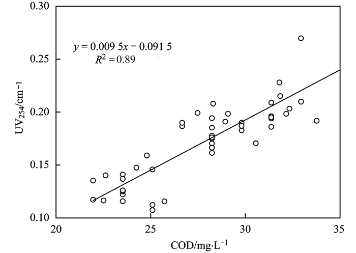 有研究表明, UV254與COD有一定的相關(guān)性, UV254值越小, 可生化性就越強(qiáng), 水中復(fù)雜有機(jī)物分解及去除效果就越好.對(duì)本實(shí)驗(yàn)數(shù)據(jù)進(jìn)行COD與UV254之間離散關(guān)系分析如圖 3所示, 并得出相關(guān)系數(shù)為0.89, 說明COD與UV254之間具有強(qiáng)相關(guān)性.具體聯(lián)系污水寶或參見http://www.dowater.com更多相關(guān)技術(shù)文檔。
