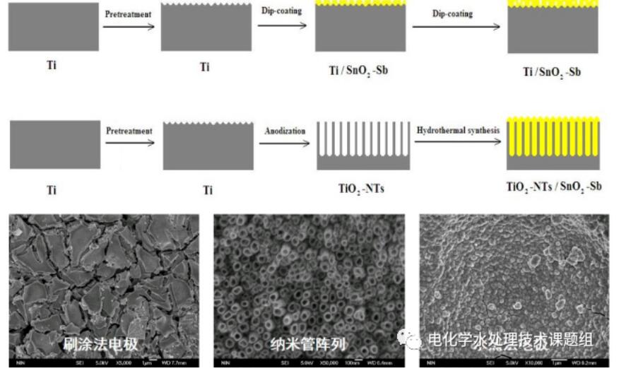 如前所述,考量一種電極材料的實(shí)用性應(yīng)該從價(jià)格、制備難易程度、穩(wěn)定性、催化性等多個(gè)維度綜合考慮。鈦基體金屬氧化物電極在上述四個(gè)方面所表現(xiàn)出來的綜合性能無疑是很優(yōu)的,并因此受到極大的關(guān)注與研究,其中鈦基體電極的功能化改性成為本領(lǐng)域的研究熱點(diǎn)之一。