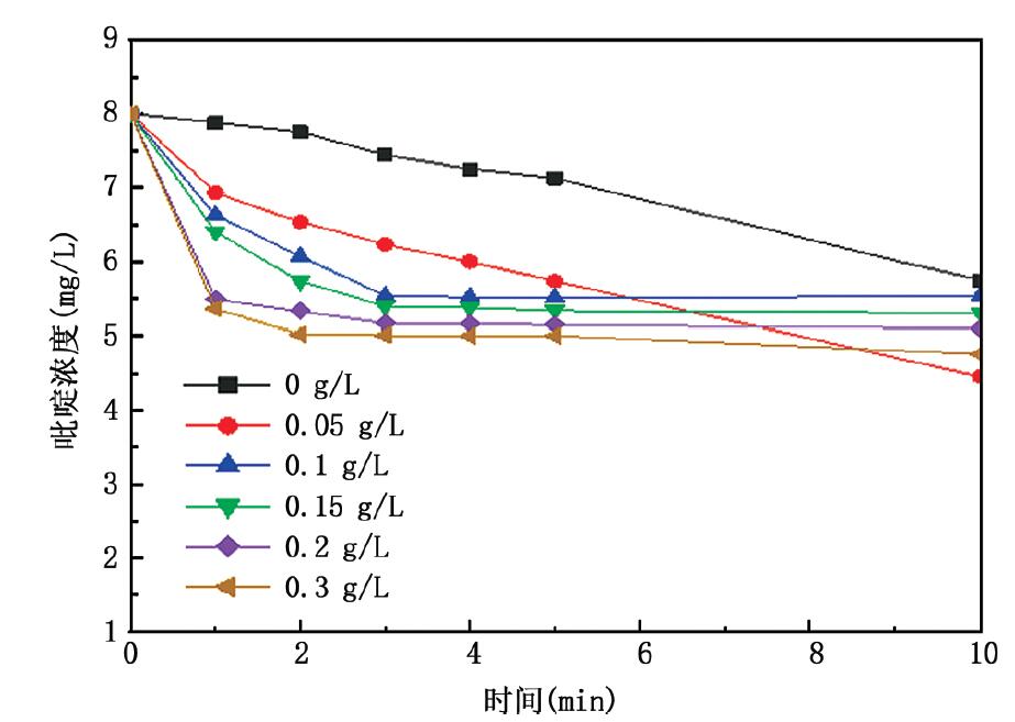 將制備的臭氧水取500 mL 置于燒杯中,加入所需質(zhì)量的吡啶與磁性活性炭,通過攪拌槳不斷攪拌。按照要求在0 min、1 min、2 min、3 min、4 min、5 min、10min 時(shí)取樣,把取得的樣品通過0. 45 微米的聚醚砜濾膜過濾去除催化劑,為了終止臭氧反應(yīng),再滴入一定量的亞硫酸鈉溶液,得到的溶液作為待測(cè)樣品保存。