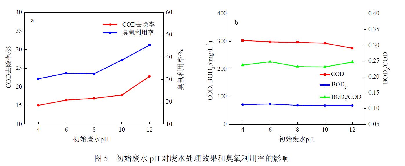 待處理廢水COD 為357.0 mg/L,BOD5/COD 為0.12。在進(jìn)氣臭氧質(zhì)量濃度為50 mg/L、RPB 轉(zhuǎn)速為1500 r/min、氣液比為5︰1、廢水溫度為20.0 ℃的條件下進(jìn)行一級(jí)處理,考察初始廢水pH 對廢水處理效果和臭氧利用率的影響,結(jié)果如圖5 所示。