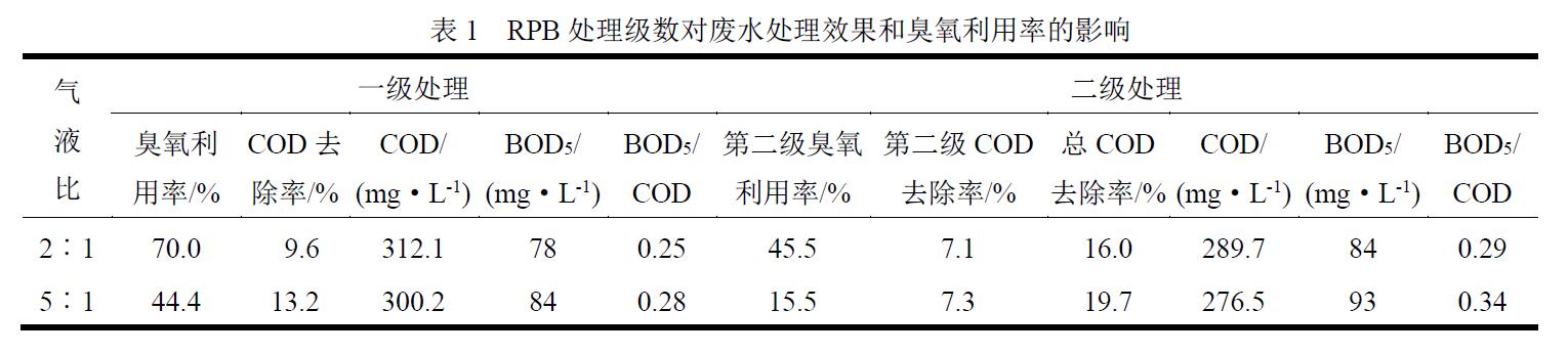 待處理廢水COD 為340.0 mg/L,BOD5/COD 為0.18。在進(jìn)氣臭氧質(zhì)量濃度為50 mg/L、RPB 轉(zhuǎn)速為1500 r/min、初始廢水pH 為7.77、廢水溫度為24.7 ℃的條件下,考察處理級(jí)數(shù)對廢水處理效果和臭氧利用率的影響,結(jié)果如表1 所示。