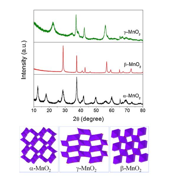 為了研究MnO2晶體結(jié)構(gòu)對其臭氧分解活性的影響及其主要影響因素,制備了3種隧道結(jié)構(gòu)MnO2,即:α、β和γ-MnO2,并對其進(jìn)行了臭氧分解實驗。通過對催化劑的結(jié)構(gòu)、形貌和氧化還原性能的表征,揭示了影響臭氧分解的關(guān)鍵因素。