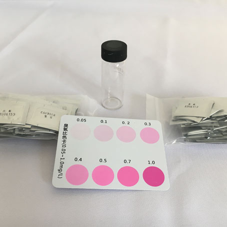 檢測原理: N,N二乙基對苯二胺(DPD)-碘化鉀(KI)測試臭氧水中濃度的原理為,臭氧與DPD發(fā)生反應呈紅色,顯色深淺與水中臭氧含量呈線性關系。