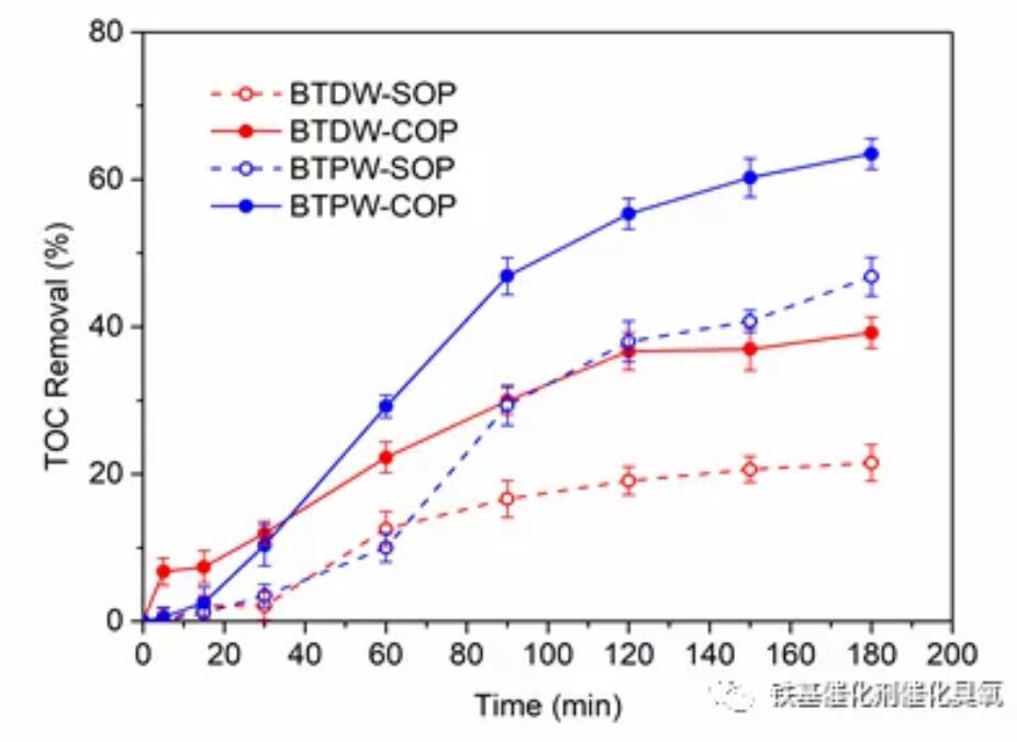 通過單獨(dú)的臭氧化過程(SOP)和催化臭氧化過程(COP)研究了水中溶解的污水有機(jī)物(EfOM)的疏水性(HPO)/親和性(TPI)/親水性(HPI)餾分的轉(zhuǎn)化。改性的鐵屑在COP中用作催化劑。兩種經(jīng)過生物處理的工業(yè)廢水中SOP和COP之間的總有機(jī)碳(TOC)去除率差異主要是由HPI降解程度不同引起的。在SOP中,HPI的累積量(在生物處理的印染廢水中)比在COP中高28.8%(在生物處理的造紙廢水中)和88.8%(在生物處理的造紙廢水中),而在這兩個(gè)過程中HPO的降解都超過90%。在早期階段(0-15分鐘),部分HPO轉(zhuǎn)化為TPI,原水中的原始HPI同時(shí)降解。在中間階段(15-60分鐘),TPI轉(zhuǎn)變?yōu)镠PI。SOP中HPI分?jǐn)?shù)中剩余的熒光物質(zhì)高于COP中的熒光物質(zhì),表明SOP中積累了更多的HPI。在熒光物質(zhì)中,芳香蛋白II和SMP類物質(zhì)被更徹底地去除,而腐殖酸類物質(zhì)則相對(duì)較難降解。此外,COP對(duì)黃腐酸類物質(zhì),SMP類物質(zhì)和腐殖酸類物質(zhì)的去除率均高于SOP,而COP和SOP對(duì)芳香族蛋白質(zhì)的去除率幾乎相同。對(duì)于分子量(MW)大于2 kDa的TPI和HPI有機(jī)污染物,COP具有比SOP更好的去除效果。SOP和COP在去除HPO餾分和MW小于2 kDa的小分子有機(jī)物方面沒有顯著差異。