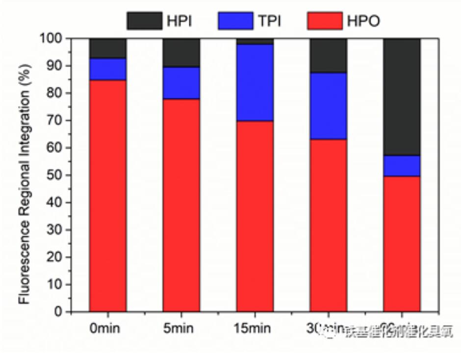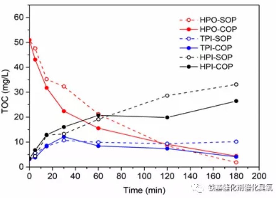 根據(jù)目前的分析手段,把印染廢水中的有機(jī)物分為三類:疏水性物質(zhì)(HPO)——紅色、過渡親水性物質(zhì)(TPI)——藍(lán)色、親水性物質(zhì)(HPI)——黑色,三種物質(zhì)(濃度以TOC表示)氧化過程中變化見下圖。