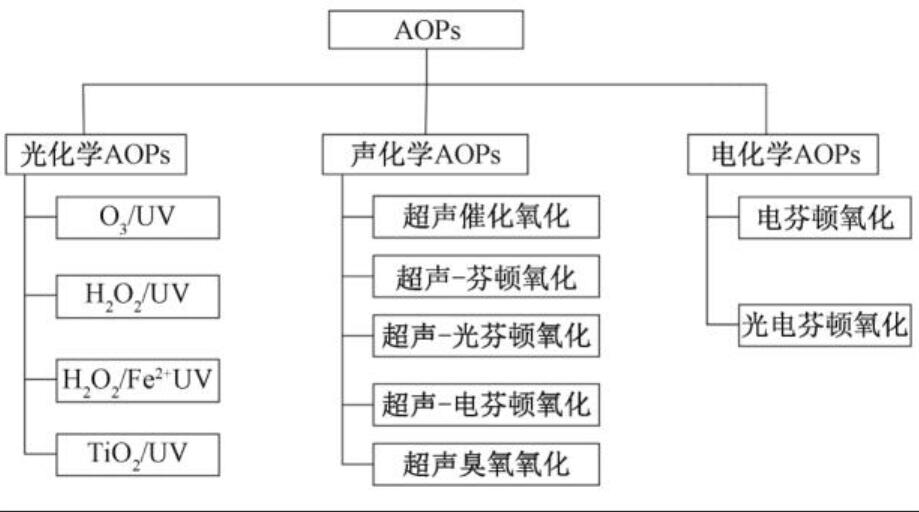 高級氧化過程(AOPs)主要包括Fenton及類Fenton氧化法、臭氧高級氧化法、電化學(xué)氧化法、超聲高級氧化法、濕式氧化法、光化學(xué)氧化法、光化學(xué)催化氧化法等。