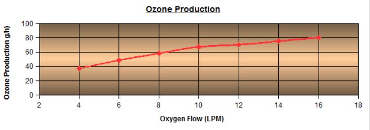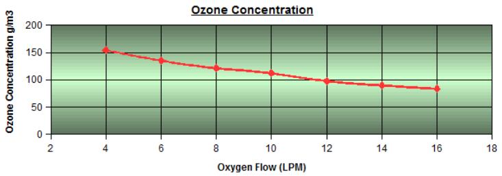 圖表顯示了臭氧發(fā)生器濃度與進(jìn)料氣體流量的比較,以顯示在任何給定流量下臭氧發(fā)生器的確切濃度。通常,臭氧發(fā)生器濃度(g/m3或重量百分比)將隨著進(jìn)氣流量(LPM或SCFH)的減少而增加。這將說明在任何給定的進(jìn)料氣流速下可能的臭氧濃度,表明該臭氧發(fā)生器將氧氣轉(zhuǎn)化為臭氧的效率。