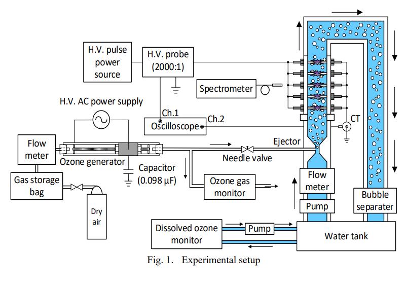 圖1顯示了一個實驗裝置。該系統(tǒng)包括臭氧發(fā)生器、噴射器、泵、脈沖電源和脈沖放電裝置。臭氧是用填充玻璃微珠(微珠尺寸:6 mm)的DBD裝置產(chǎn)生的。臭氧發(fā)生器由一個逆變電源(4210,NF公司)和一個升壓變壓器(YHT-15K-0.5K, Yamabishi Electric)施加交流高壓。使用高壓探頭(EP-50K,日新脈沖電子公司)測量臭氧發(fā)生器的施加電壓(V)。電荷(q)是通過積分電容器上的電壓降(0.098µF)來測量的。用V-q利薩若圖面積乘以工頻計算臭氧發(fā)生器的放電功率。臭氧氣體濃度采用紫外吸收型臭氧監(jiān)測儀測量。干燥空氣(絕對濕度:119.3 mg m−3)作為臭氧發(fā)生器的氣源。通過針閥調(diào)節(jié)臭氧發(fā)生器的氣體流量為2.0 L min−1。