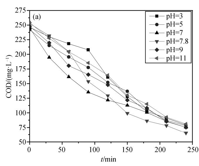 在催化劑投加量為 30%, 臭氧流量為 3 L/min的條件下, 設(shè)置廢水初始 pH 分別為 3, 5, 7, 7.8 (不調(diào) pH), 9 和 11, 探討廢水初始 pH 對(duì)催化臭氧化降解效果的影響, 結(jié)果如圖所示。