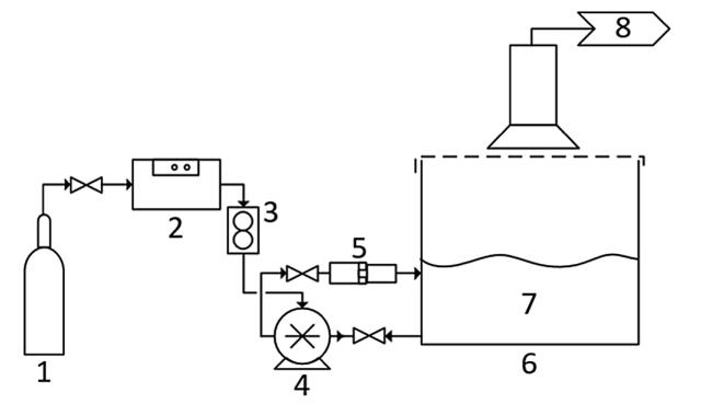 圖1所示。用于批量可處理性測試的中試系統(tǒng)。1.醫(yī)療氧氣;2. 臭氧發(fā)生器Magnum 200;3.。流量計(jì)(8l /min);4.微泵;5。靜態(tài)混合器;6.臭氧化反應(yīng)器;7.流出物;8.事件。