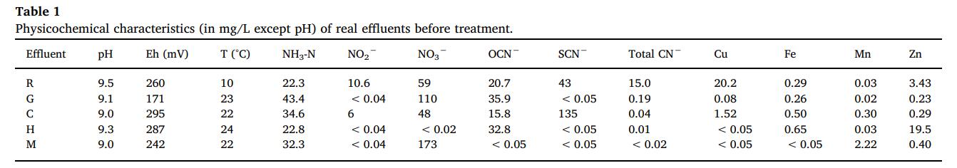 對(duì)位于加拿大QC Abitibi-Temiscamingue的五個(gè)金礦的真實(shí)廢水進(jìn)行了采樣(表1)。在礦山的不同點(diǎn)對(duì)廢水進(jìn)行了采樣:(1)脫水水;(2)更終出水;(3)尾礦庫(池)上清水,NH3-N濃度變化范圍為22.3 ~ 43.4 mg/L(表1)。
