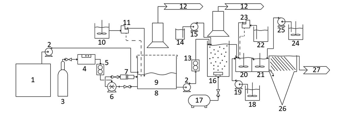 圖2所示。連續(xù)流臭氧凈化中試系統(tǒng)。1.出水M 800 L;2.泵;3.。醫(yī)療氧氣;4.臭氧發(fā)生器Magnum 200;5.流量計(jì);6.微泵;7.靜態(tài)混合器;8.臭氧化反應(yīng)器;9.出水M 100 L TRH = 1.5 h;10.2.5 N NaOH;11.pH值控制器;12.真空;13.流量計(jì);14.25%過氧化氫;15.泵;16.曝氣步驟;17.空氣;18.硫酸鐵;19.泵;20.。凝固;21.絮凝;22.Na2CO3;23.pH值控制器;24. Percol E10聚合物;25.泵;26.沉降槽;27.更后的廢水。