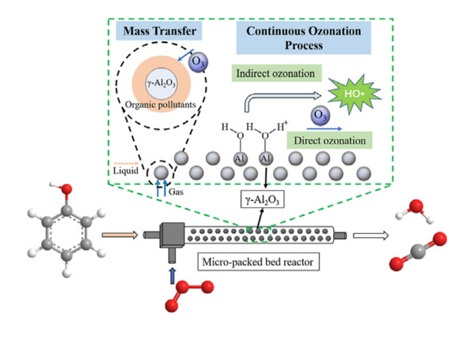 結果表明,臭氧氧化在25 s內對亞甲基藍的降解效率為74.6%,反應速率常數約為0.05 s-1 (He et al., 2016)。Nieves等人報道,在康寧先進流動反應器(AFR)中,當液體流速為5 mL/min,氣體流速為100 mL/min,傳質系數為0.80 s-1時,蘇丹紅7B染料的轉化率為66.5% (Nieves- remacha and Jensen, 2015)。微填充床反應器是在滴流床反應器小型化的基礎上提出的。由于小填充顆粒(顆粒直徑<500 mm)的傳輸尺寸小,因此它具有增強傳熱傳質和加快多相混合的優(yōu)點(Zhang et al., 2018a)。mpbr由于其在氣-液-固反應(如加氫)中的優(yōu)勢而受到關注(Losey et al., 2000;Yang et al., 2018;Tu等人,2020)和氧化(Yoswathananont等人,2008;al - rifai et al., 2014,2016)。al - rifai et al.(2016)報道m(xù)PBR氣液比的增加提高了苯甲醇的轉化率和苯甲醛的選擇性。Tu等(2020)報道m(xù)PBR中連續(xù)加氫反應速率提高了100倍。我們之前的研究表明,mpbr中的氣液傳質系數可高達0.12e0.39 s-1,比大型反應器的傳質系數大1-2個數量級(注:反應器參數與本工作一致)(Zhang et al., 2018a;Sang等人,2020)。迄今為止,mpbr與臭氧氧化相結合處理有機污染物的研究尚未見報道。因此,優(yōu)異的氣液傳質速率表明mPBR具有實現臭氧化高效降解難降解有機污染物的潛力。本文研究了一種基于mpbr的連續(xù)臭氧化系統,用于降解難降解有機污染物。考察了液流量、氣流量、初始pH、初始O3濃度和初始苯酚濃度對苯酚和COD去除率的影響。比較了氧化鋯陶瓷球團和g Al2O3球團填料在mPBR中的去除率。此外,在很佳操作條件下對幾種典型的有機污染物(包括酚類、抗生素和染料)進行了處理。