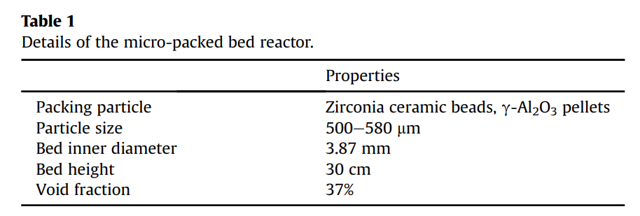 mPBR出口的氣液混合物被收集在一個帶塞的瓶子里,在這個瓶子里進行氣相和液相的分離。未反應臭氧由臭氧監(jiān)測儀測量,很終通過臭氧破壞部分破壞。當臭氧被破壞時,99.9%的臭氧轉化為氧氣(表S1)。采樣時,切換三通球閥采集液體樣品。樣品采集后立即測量污染物和COD的去除率,與24 h后測量的去除率變化不大,在11.2%的范圍內。因此,未反應臭氧對污染物和COD的去除沒有影響。微填料床反應器的詳細情況如表1所示。反應器管由不銹鋼制成,長30厘米,內徑3.87毫米。將尺寸為500e580 mm的球形氧化鋯陶瓷珠或g-Al2O3球團裝入管中,孔隙率為0.37。