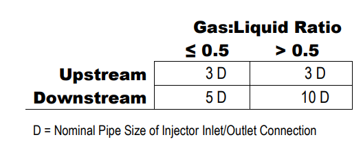 3.Mazzei建議在注射器的上游和下游安裝一條與注射器直徑相同的直管。關(guān)于射流器和閥門之間的很小互連管道長度要求、管道膨脹或方向變化,請參閱下表。